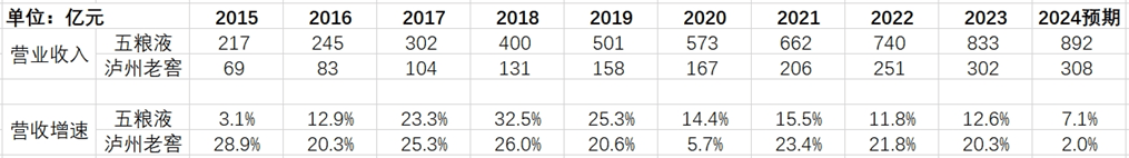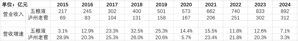 笔者对比五粮液、泸州老窖两家收入数据发现,自从2016年行业进入景气周期后,一直到2022年,泸州老窖增速一直能与五粮液持平或超过。但在2023年-2024年,从真实回款增速就能发现,泸州老窖的增速骤然下降。